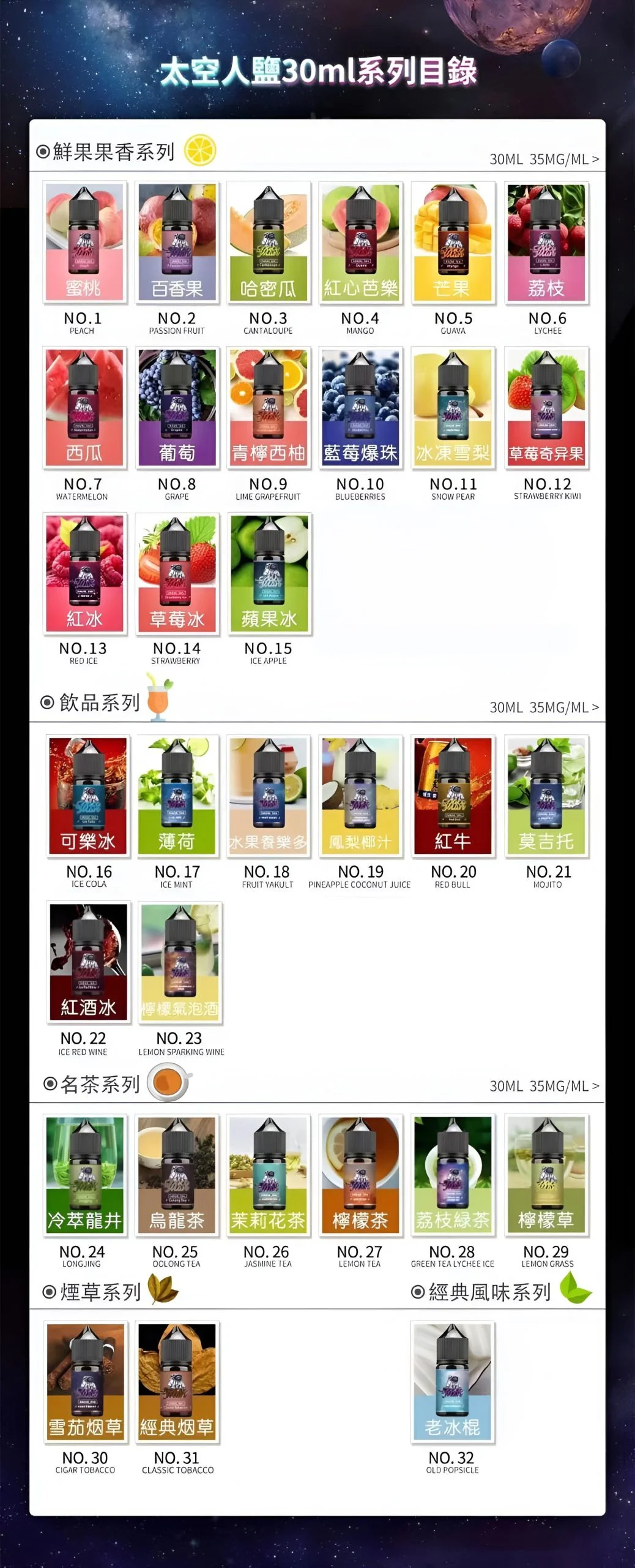 - ✅ 超大風味矩陣:多達 32 種星際主題風味,涵蓋水果、茶飲、酒類及菸草。